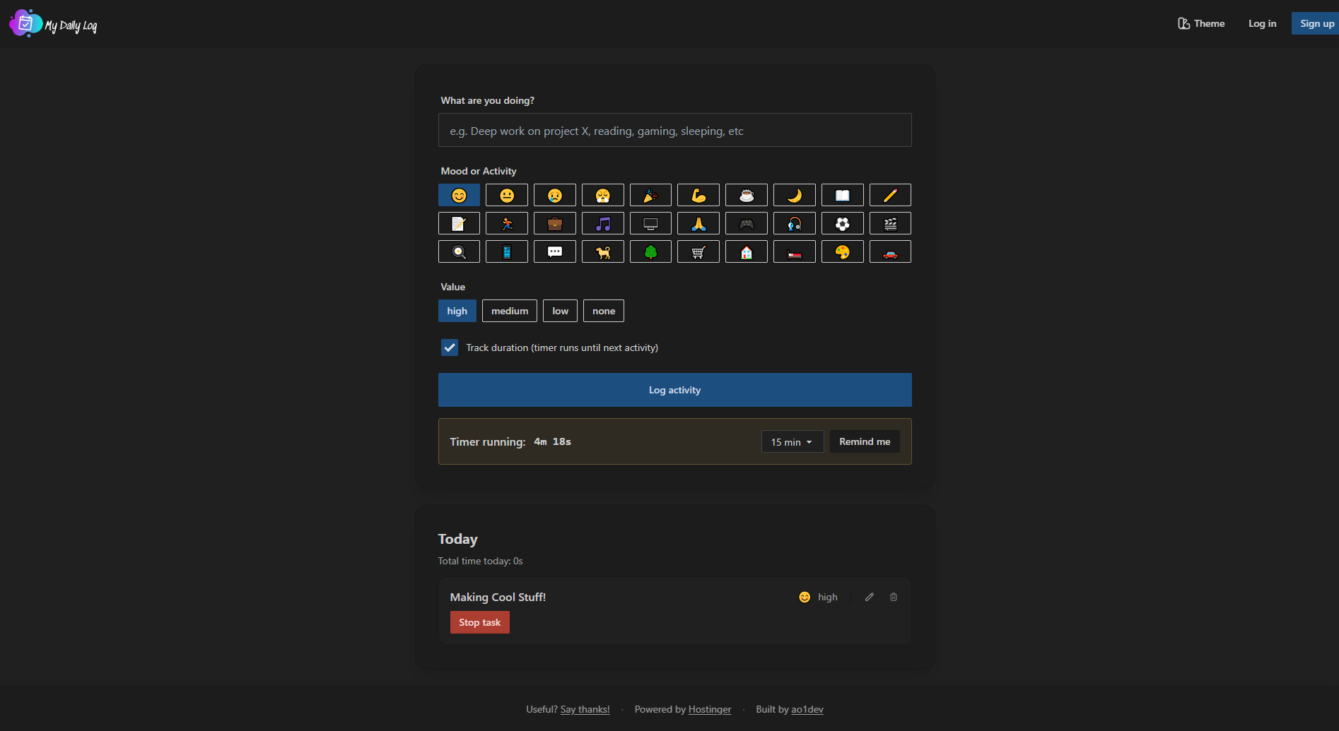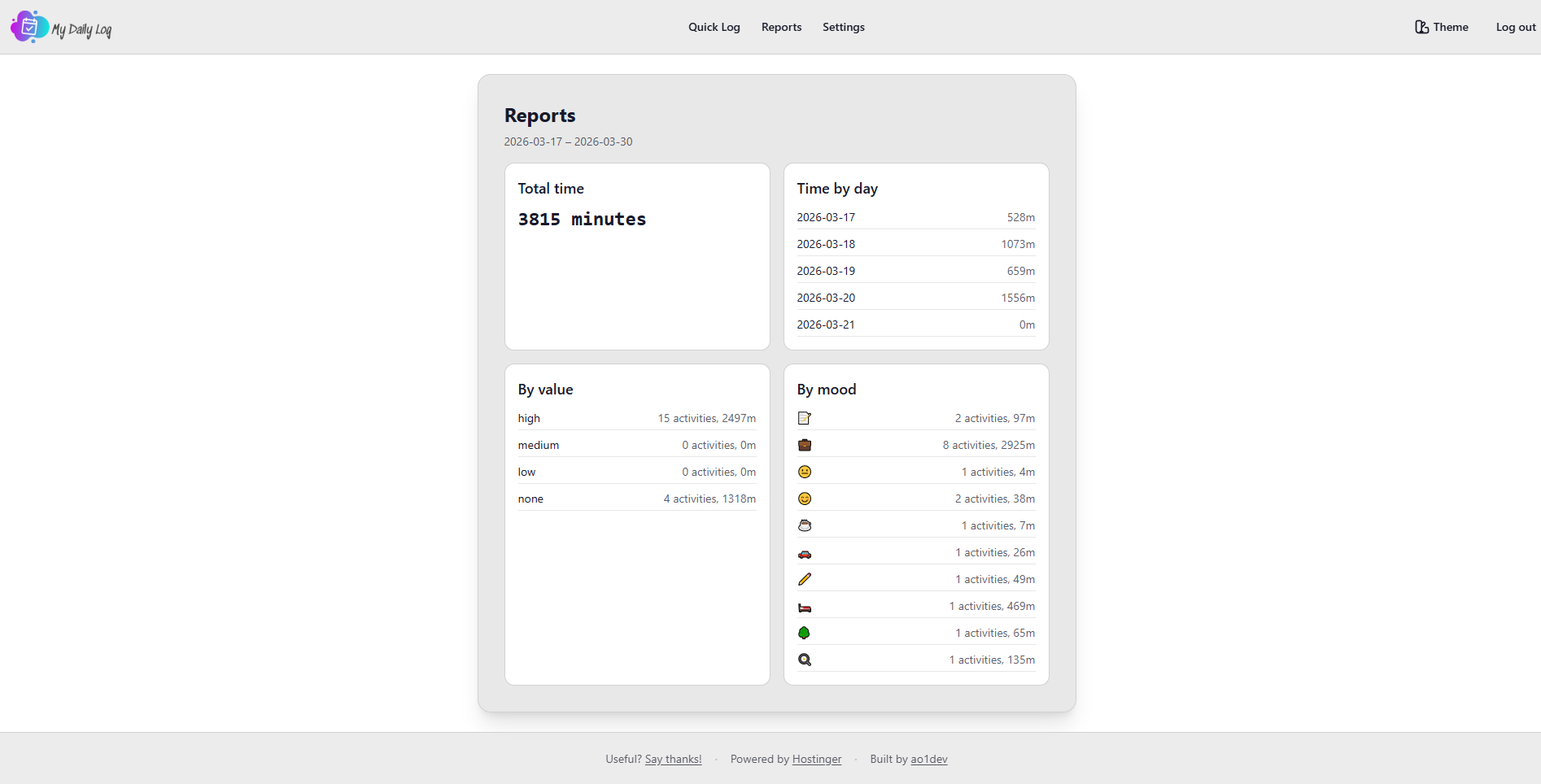 This project was a compact daily activity logger where users can set what they are doing, track mood or activity values, and keep lightweight history reports for entries over time.